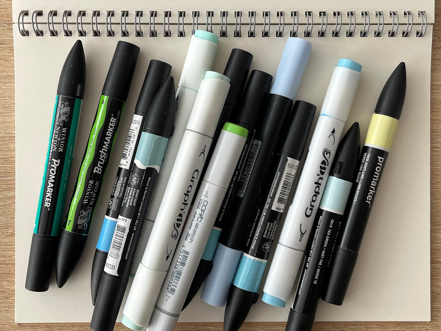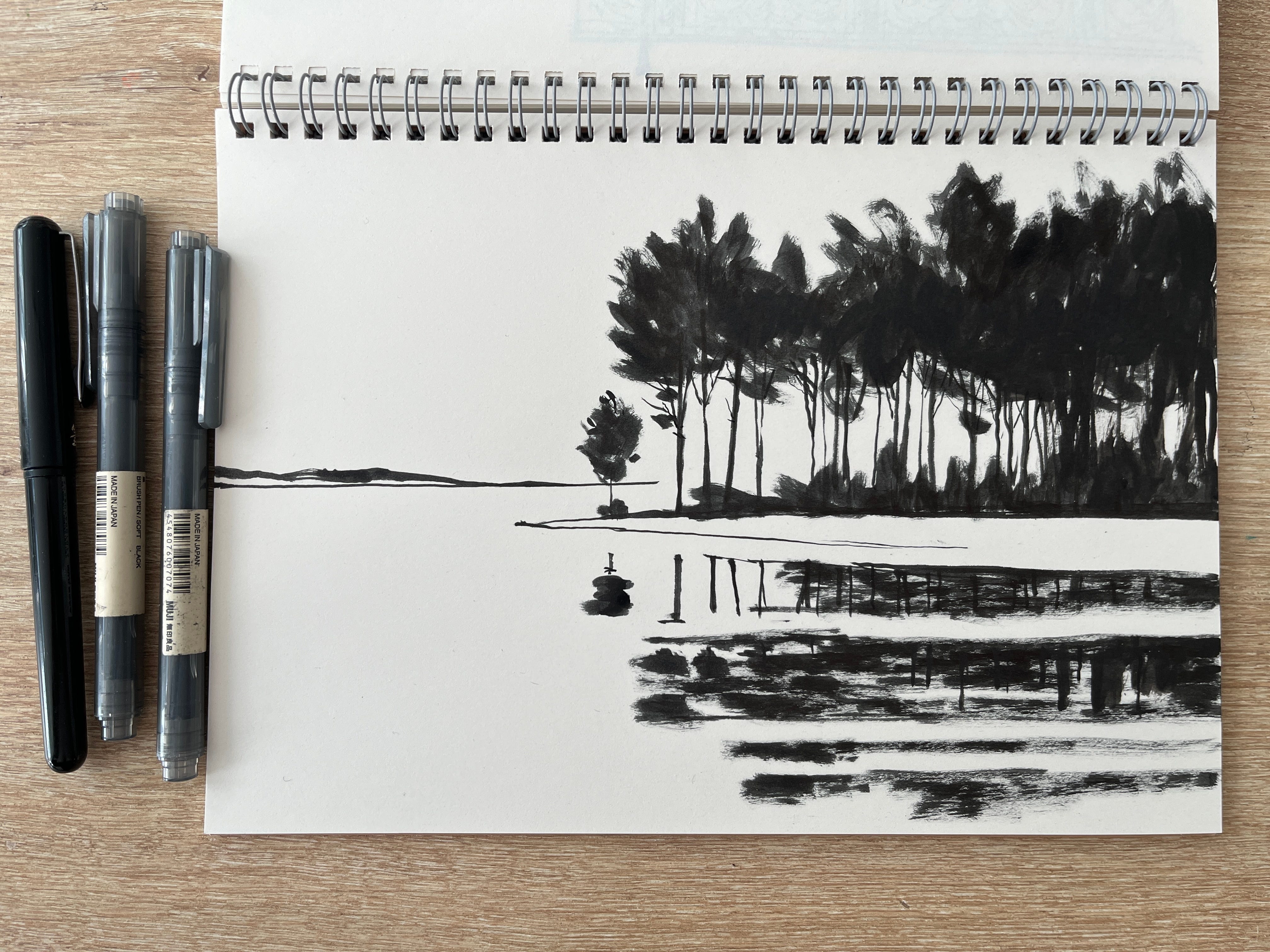 For the first ones, I used MUJI’s brush pens. I especially love the flexibility of their tips—both precise and soft, offering a wide range of textures with a single tool. The sketchbooks also come from MUJI, but you can find paper of similar quality from other shops and manufacturers.