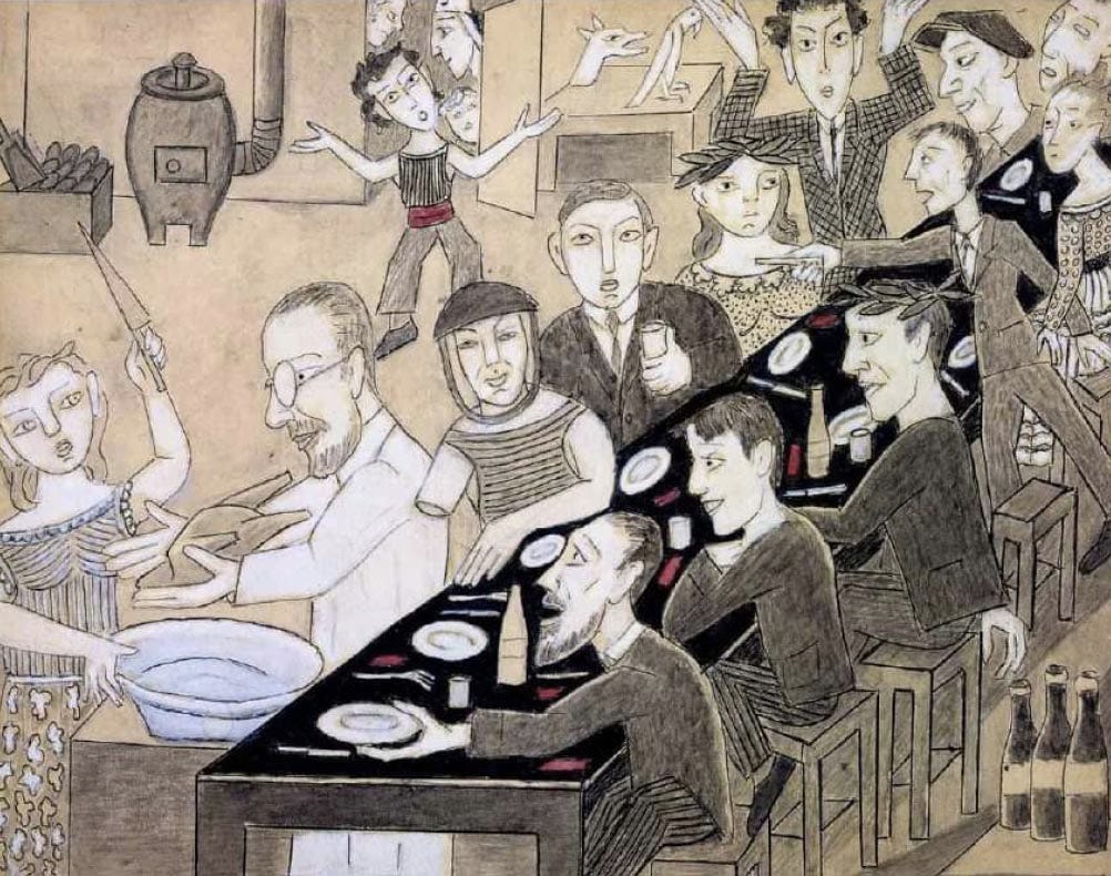 Marie Vassilieff, Banquet Braque, Sunday, January 14, 1917, gouache on cardboard, 24 × 30.5 cm. All rights reserved, Claude Bernès collection.